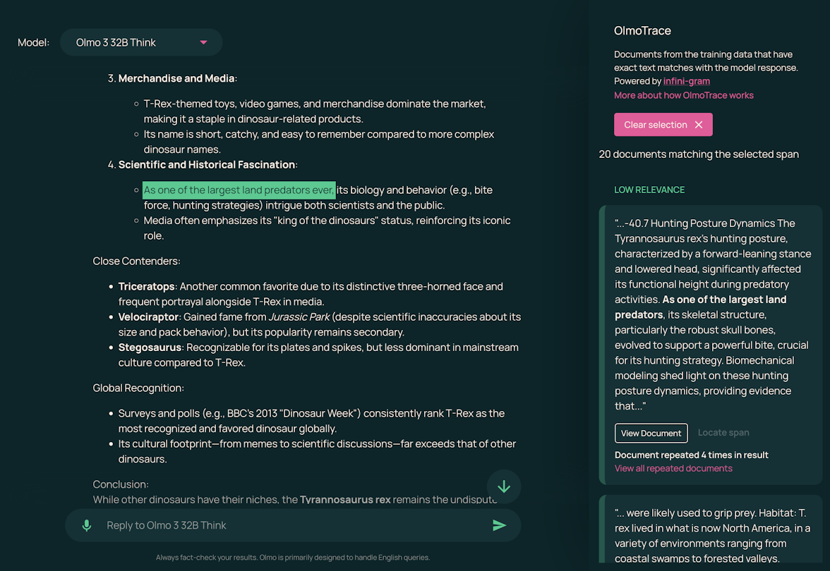For example, in the Ai2 Playground, you can ask Olmo 3-Think (32B) to answer a general-knowledge question, then use OlmoTrace to inspect where and how the model may have learned to generate parts of its response. This closes the gap between training data and model behavior: you can see not only what the model is doing, but why—and adjust data or training decisions accordingly.