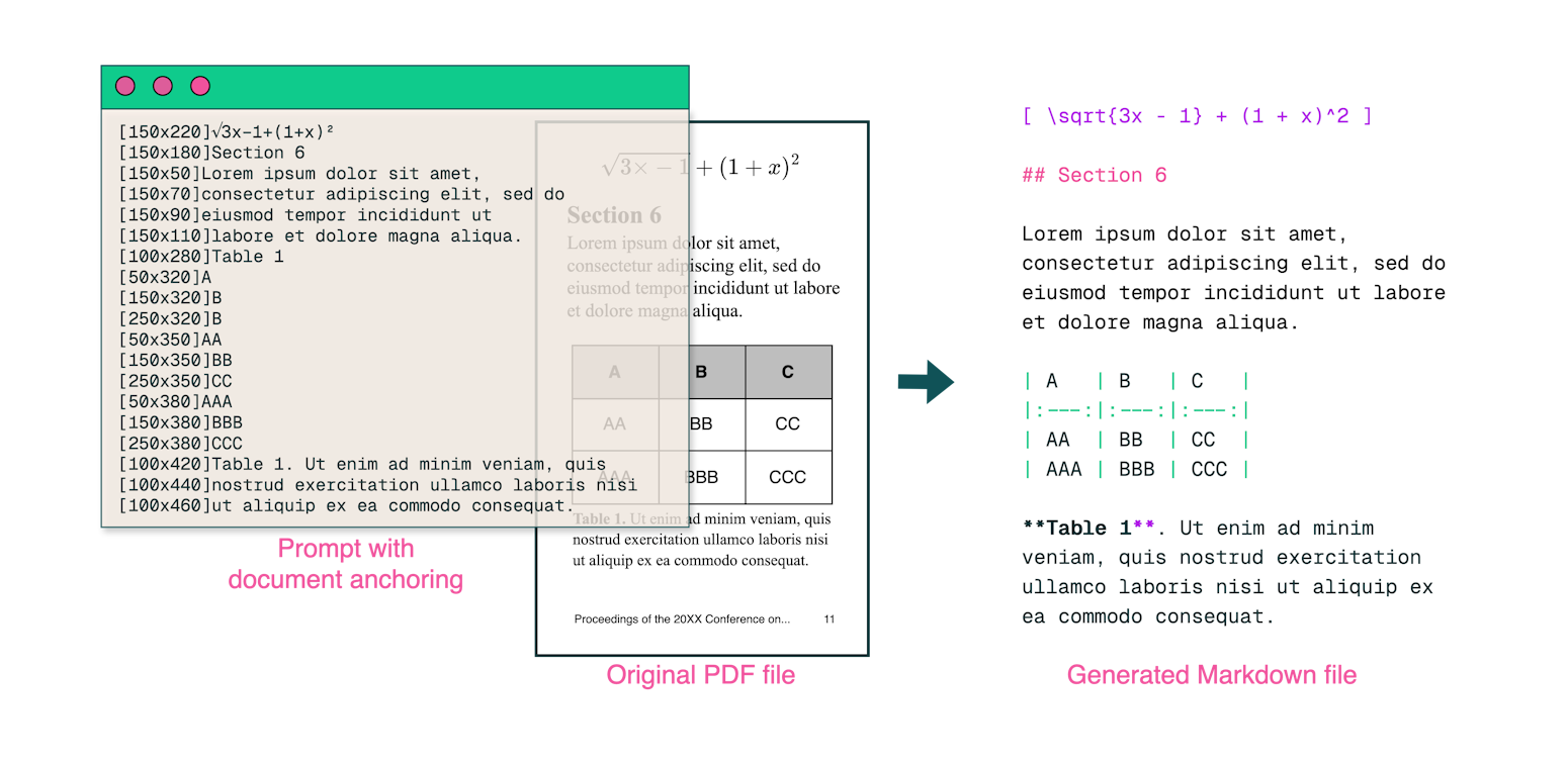 To obtain high-quality data for training olmOCR, we develop a technique called document anchoring. This method leverages any text and metadata present in your PDF files to improve the quality of the extracted text.