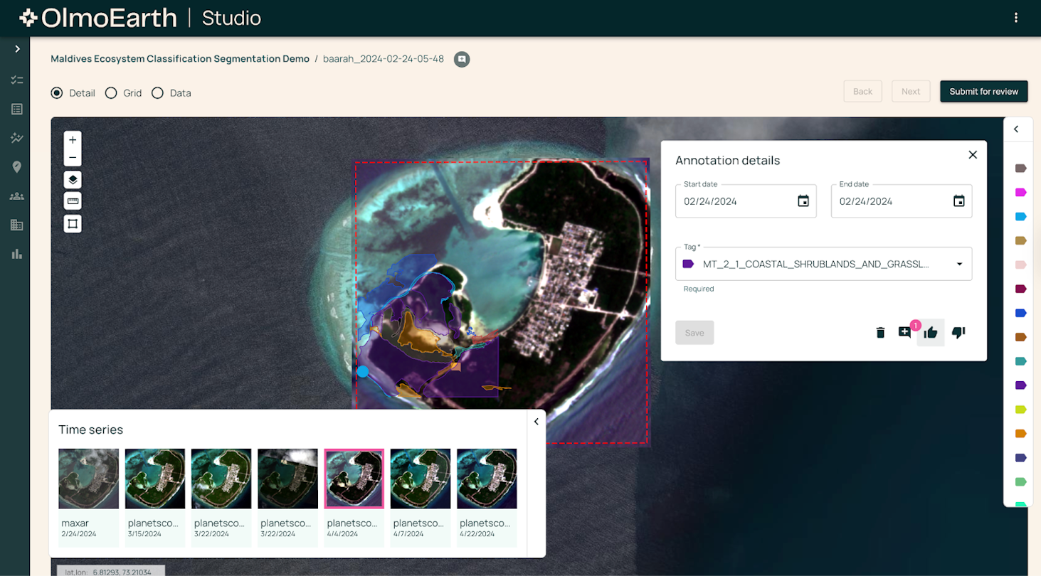 To that end, OlmoEarth Platform is designed for frequent data refreshes on relatively modest budgets—a major goal of many organizations. Users begin with a question and area of interest – e.g., track mangrove loss along this coast – then assemble a label set and choose an OlmoEarth model aligned to their needs.
