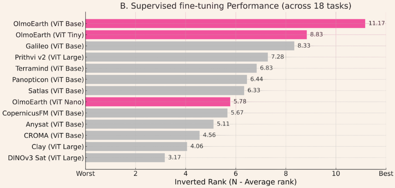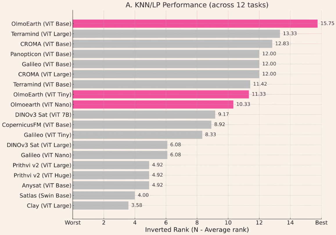 OlmoEarth is industry-leading across scene and patch classification, semantic segmentation, object and change detection, and regression in both single-image and time-series domains. OlmoEarth outperforms many recent foundation models from industrial research labs – including Meta's DINOv3, IBM/NASA's Prithvi, and IBM's Terramind – as well as leading academic models like CROMA and Panopticon, and several of our previously-released geospatial models including Satlas and Galileo.