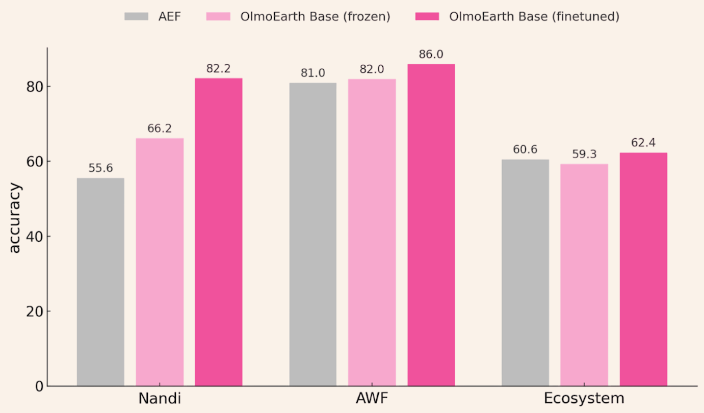 We also compared OlmoEarth to Google DeepMind's AlphaEarth Foundations (AEF). AEF required a different analysis because Google released annualized embeddings, but not the model itself. When we compared the AEF and OlmoEarth embeddings using kNN on three tasks, we found OlmoEarth performed on par or better than AEF. However, once we fine-tuned OlmoEarth, it outperformed AEF substantially. This underscores the importance of a platform that makes fine-tuning and model customization as accessible as possible.