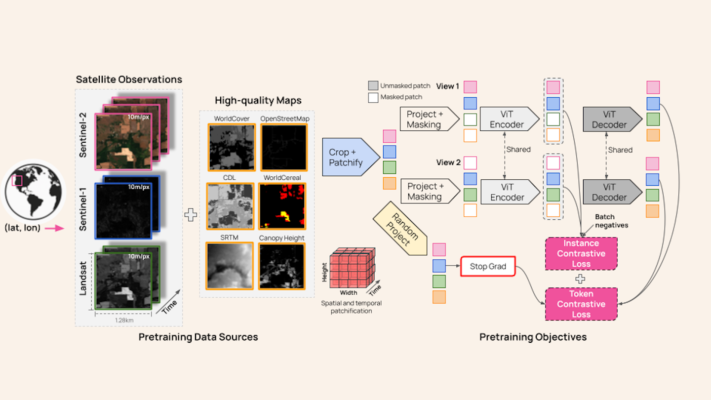 We train OlmoEarth by masking parts of a subset of the satellite images, hiding that information from the model. The model learns by using the other visible parts of the satellite images to predict those hidden portions. This self-supervision, combined with weakly supervised learning via map modalities, enables OlmoEarth to build robust general representations from large observational datasets.