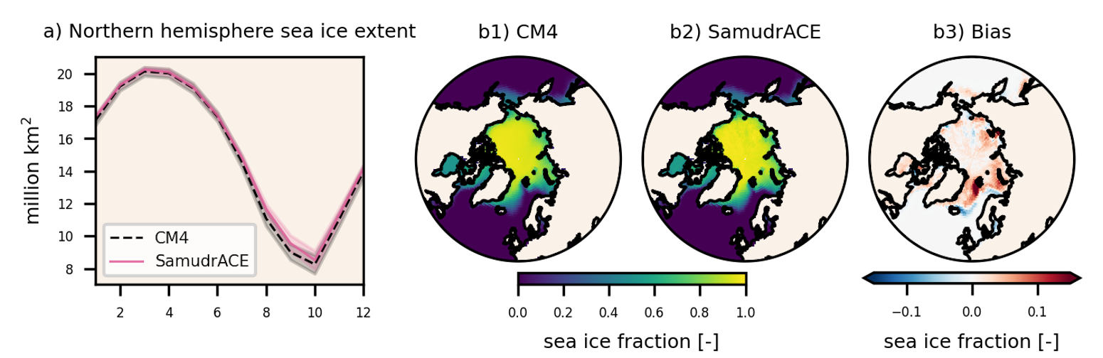 - Samudra, an emulator for the ocean developed by collaborators at M2LInES and extended by the Climate Modeling team to prognose sea ice